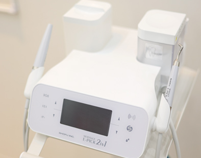 当院では、患者様の負担が少なくなることを第一に考えて治療を行います。治療時の痛みが苦手な患者様は多いことから、各種麻酔方法の工夫など、痛みに配慮して治療を進めます。また、患者様の歯を残すように心がけており、カリエスチェッカーや5倍速コントラなどを用いて、できる限り抜かない・削らない治療を行います。